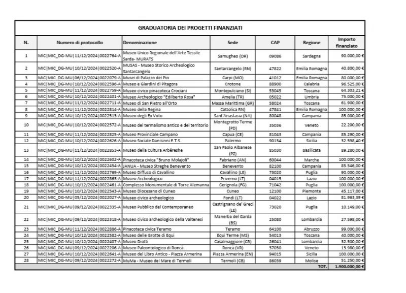 In totale sono stati finanziati 28 piccoli musei italiani ai quali sono stati distribuiti i quasi due milioni di euro statali. Tra gli interventi che i fondi andranno ad incrementare c'è "il miglioramento dell’accoglienza e della fruizione, la realizzazione di nuovi apparati informativi e comunicativi, l’allestimento di spazi espositivi, la mediazione culturale, la promozione del patrimonio diffuso e l’abbattimento delle barriere architettoniche". La distribuzione dei fondi ha visto cifre variabili che sono andate da un minimo di 10mila euro a un massimo di 100mila. Di seguito la lista completa con gli importi assegnati a ciascun museo: