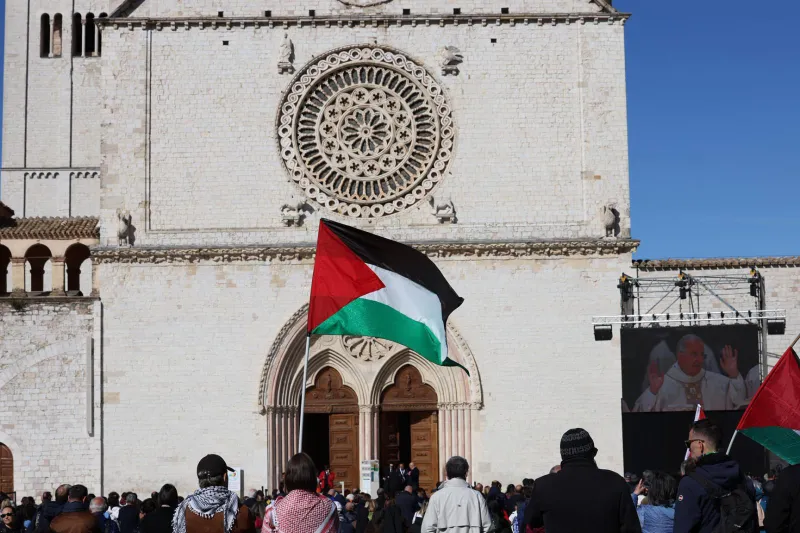 Mentre la Premier teneva il suo discorso sono apparse diverse bandiere della Palestina sventolanti sul prato davanti alla Basilica Superiore di San Francesco. Le bandiere sono state esposte spontaneamente da cittadini presenti alle celebrazioni.