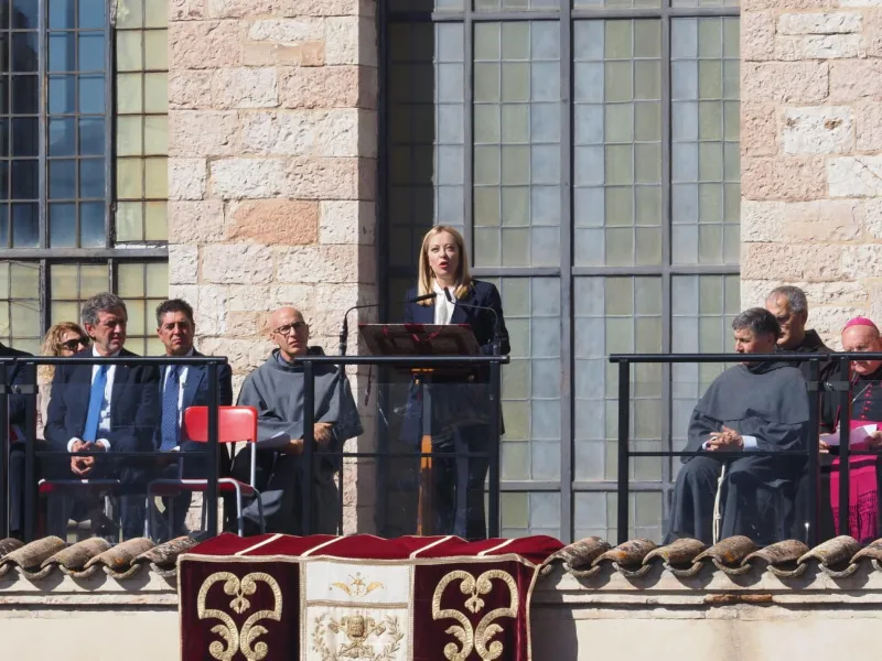 Dalla Loggia del Sacro Convento di San Francesco, dopo il saluto del ministro generale dell’Ordine dei Frati Minori Conventuali, fra Carlos Alberto Trovarelli, la Presidente del Consiglio dei Ministri della Repubblica Italiana, Giorgia Meloni, nel suo discorso ha esaltato la figura di San Francesco riportando il suo esempio in tempi difficili allora come quelli attuali, con il suo esempio di pace da costruire giorno dopo giorno.