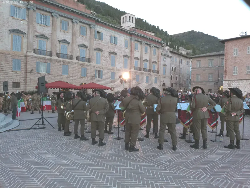 Alle 18.30, la cornice maestosa di Piazza Grande ha ospitato il concerto delle fanfare di Gubbio e Orzinuovi. Il Palazzo dei Consoli, illuminato per l’occasione con i colori del tricolore, ha fatto da sfondo a un repertorio che ha unito brani della tradizione bersaglieresca a pagine di musica classica.