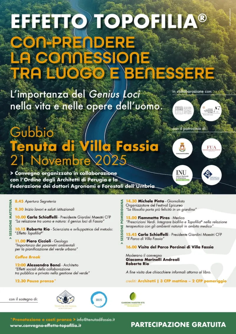 È su queste premesse che nasce il convegno “Effetto Topofilia – Con-prendere la connessione tra luogo e benessere”, in programma a Gubbio, presso la Tenuta di Villa Fassia, il 21 novembre 2025.