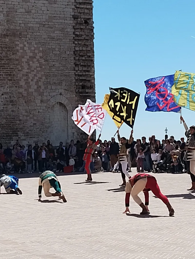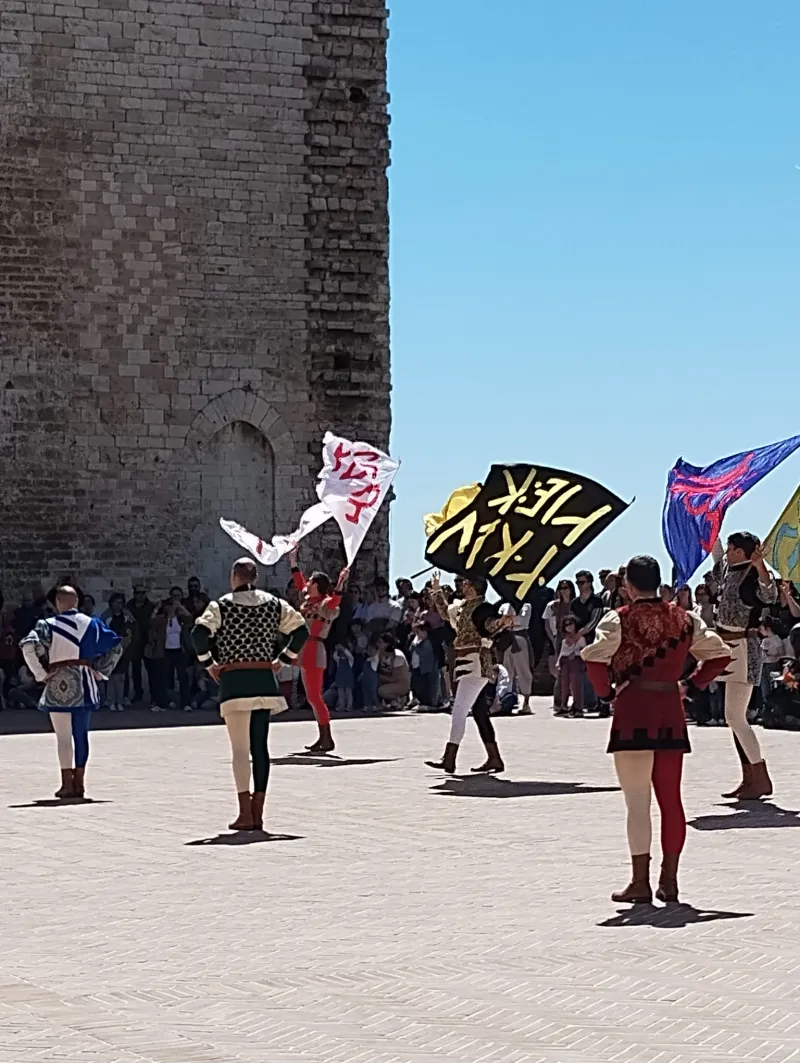 La mattinata si è conclusa in Piazza Grande, cuore simbolico di Gubbio, dove si è svolto uno dei momenti più attesi e coinvolgenti: l’esibizione degli Sbandieratori di Gubbio.