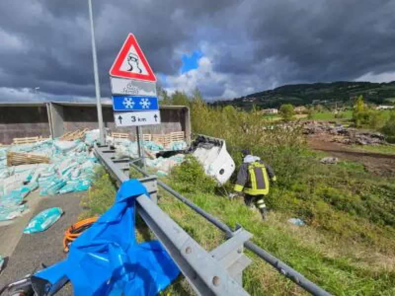 Il camion trasportava materiale cementizio, che si è riversato quasi completamente sul manto stradale, creando una situazione di ulteriore pericolo per gli automobilisti e rendendo necessario l’intervento dei mezzi di soccorso e delle squadre ANAS di pulizia stradale.