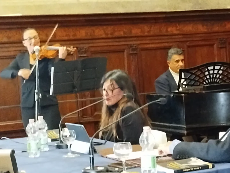 A legare e alleggerire il confronto, senza ridurne la densità, sono stati i tre intermezzi musicali eseguiti da Cecilia Bellucci al violino e Luigi Girlanda al piano. Non semplici pause, ma momenti di respiro capaci di trasformare la presentazione in un’esperienza più ampia, dove la parola e la musica si sono alternate come due modalità complementari di espressione e interiorizzazione.