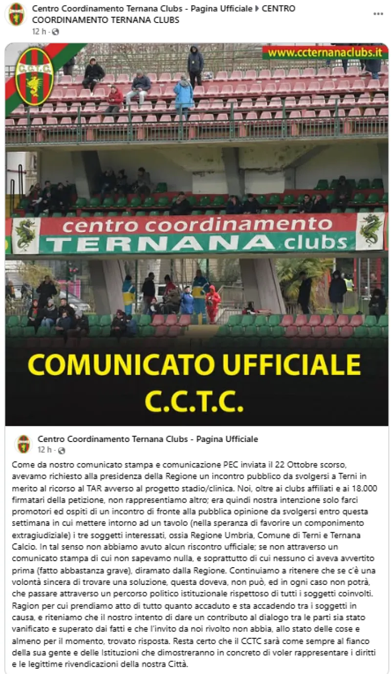 In questo clima di cauta attesa, il Centro di Coordinamento Ternana Club (CCTC) ha deciso di chiudere la porta a un incontro pubblico, inizialmente proposto come spazio di confronto tra Regione, Comune e Ternana.