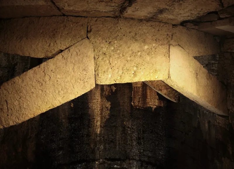 La copertura, composta da due imponenti capriate monolitiche, ognuna del peso di circa otto tonnellate, dimostra la straordinaria capacità costruttiva degli Etruschi, che riuscirono a garantire stabilità e solidità per millenni senza l’uso di malta o leganti.
