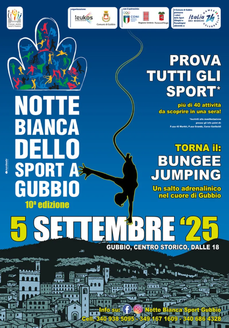 La decima edizione della Notte Bianca dello Sport accende l'entusiasmo di Gubbio. Dopo una lunga pausa, venerdì 5 settembre 2025, le vie e le piazze del centro storico torneranno a pulsare di energia, suoni, movimento e passione sportiva. Grazie alla sinergia fra l’associazione Leukos e il Comune di Gubbio, con il patrocinio dell’assessorato allo Sport, l'intera città si trasformerà per una sera in un grande palcoscenico dedicato a oltre 50 discipline sportive da scoprire, provare e amare.