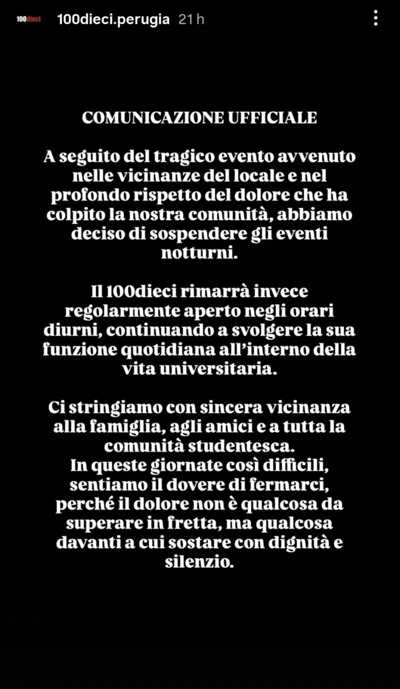 "A seguito del tragico evento - si legge tra le storie Instagram della pagina del locale - avvenuto nelle vicinanze del locale e nel profondo rispetto del dolore che ha colpito la nostra comunità, abbiamo deciso di sospendere gli eventi notturni. Il 100dieci rimarrà, invece, regolarmente aperto negli orari diurni, continuando a svolgere la funzione quotidiana all'interno della vita universitaria".