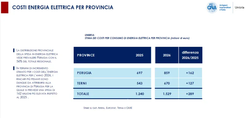 La distribuzione territoriale dei rincari, inoltre, racconta di un’Umbria spaccata in due, ma accomunata dalla stessa morsa energetica. La provincia di Perugia si vedrà addebitare il 56% dei maggiori costi per l’energia elettrica, pari a 162 milioni di euro. Alla provincia di Terni andrà il restante 44% , ovvero 127 milioni di euro. Un divario che riflette la diversa densità industriale dei due territori, ma che non alleggerisce la pressione su nessuno dei due.