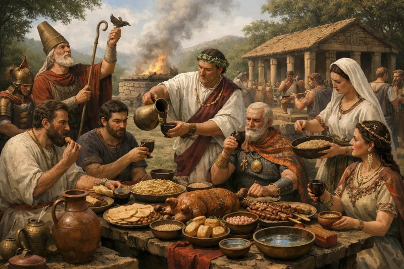 Anche qui il rito non va visto come gesto cruento isolato, ma come parte di una economia sacra e comunitaria: chi officiava sosteneva un costo, metteva a disposizione gli animali, e il sacrificio si concludeva in una forma di redistribuzione e di verifica della qualità delle offerte. Persino gli strumenti di cottura – spiedi, alari, sostanze grasse o impasti di condimento – compaiono nelle Tavole, restituendo un livello di dettaglio sorprendente.