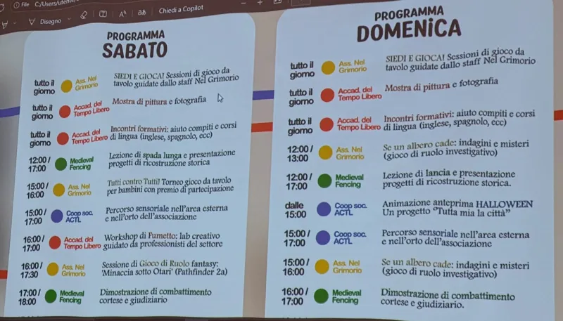 Ci saranno incontri formativi, giochi di ruolo, workshop di fumetto, lezioni di scherma medievale, mostre di pittura e di fotografia. Anche il giardino sarà aperto ed è previsto uno speciale percorso sensoriale. Tra le attività non mancheranno infine quelle a tema Halloween.