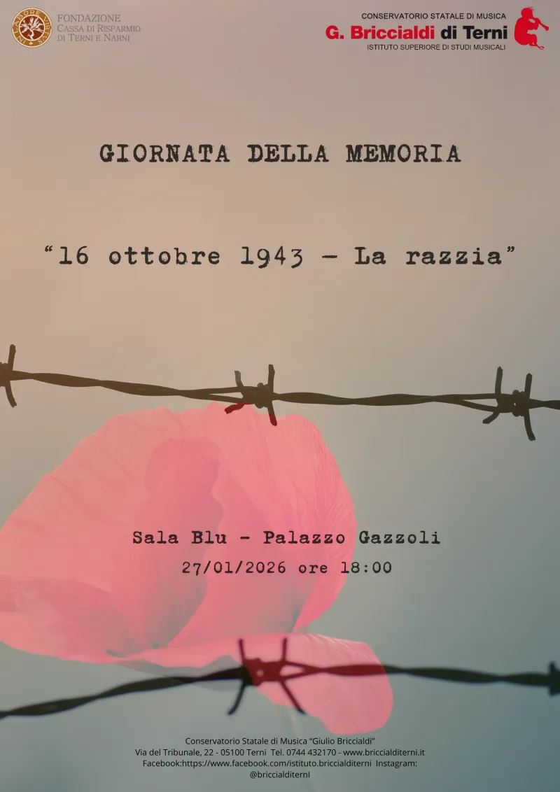 Per non dimenticare. In occasione della Giornata della Memoria, il Conservatorio Statale di Musica “Giulio Briccialdi” di Terni - in collaborazione con la fondazione Carit - promuove un Concerto per la Memoria in programma martedì 27 gennaio 2026 alle ore 18.00 alla Sala Blu di Palazzo Gazzoli, un appuntamento aperto alla città che unisce musica e parola in un racconto di forte intensità civile e culturale.