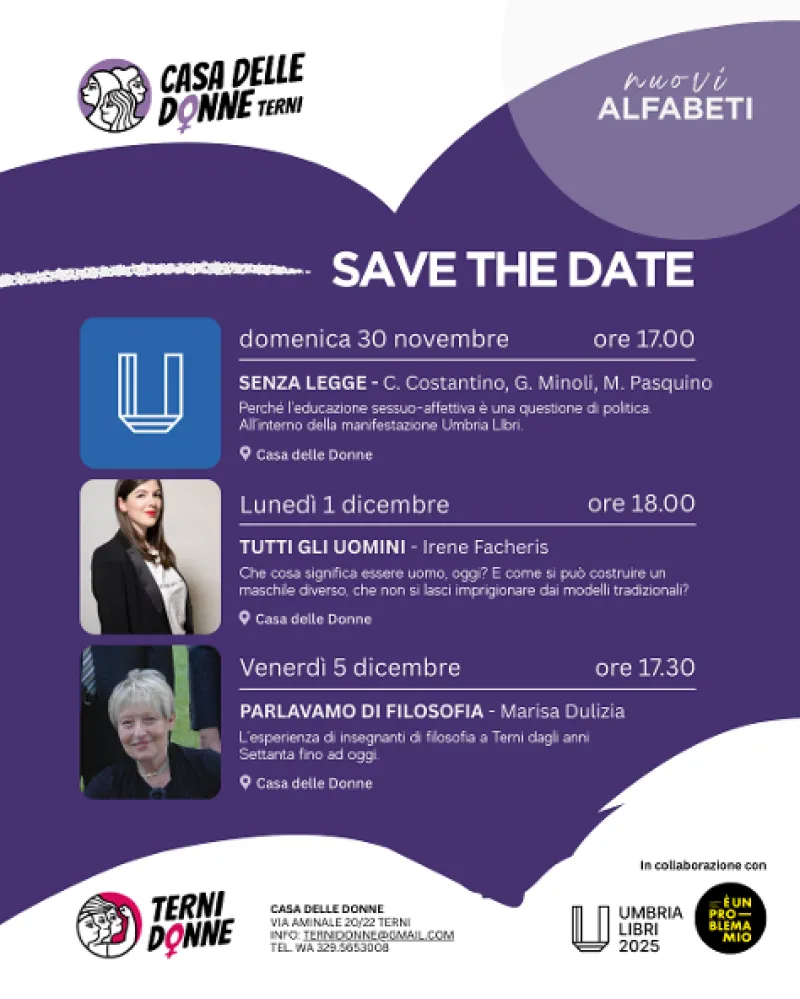 Ad aprire il calendario, domenica 30 novembre alle 17:00, sarà la presentazione del libro 'Senza Legge' di Celeste Costantino, vicepresidente della Fondazione Una Nessuna Centomila. L'incontro, inserito all'interno della manifestazione UmbriaLibri, verterà sul ruolo dell’educazione sessuo-affettiva nella costruzione di una società più equa e consapevole. Lo stesso giorno, ancora nell’ambito di UmbriaLibri, l’associazione Terni Donne parteciperà alla presentazione del libro 'La ragazza di Savannah' di Romana Petri, in Bct alle ore 19:00.